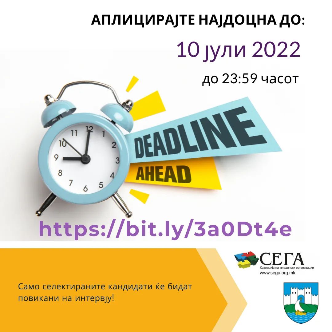 Целосната апликација за вработување во Младинскиот Центар може да се добие на следниот ЛИНК (https://ec.europa.eu/eusurvey/runner/MCOPersonal2022). Краен рок за аплицирање е 10.07.2022 до 23:59 часот.