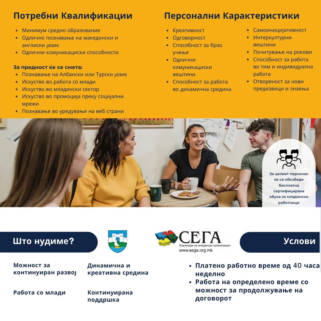 За таа цел, Коалицијата на младински организации СЕГА објавува повик за вработување на три лица за Младинскиот Центар- Охрид.