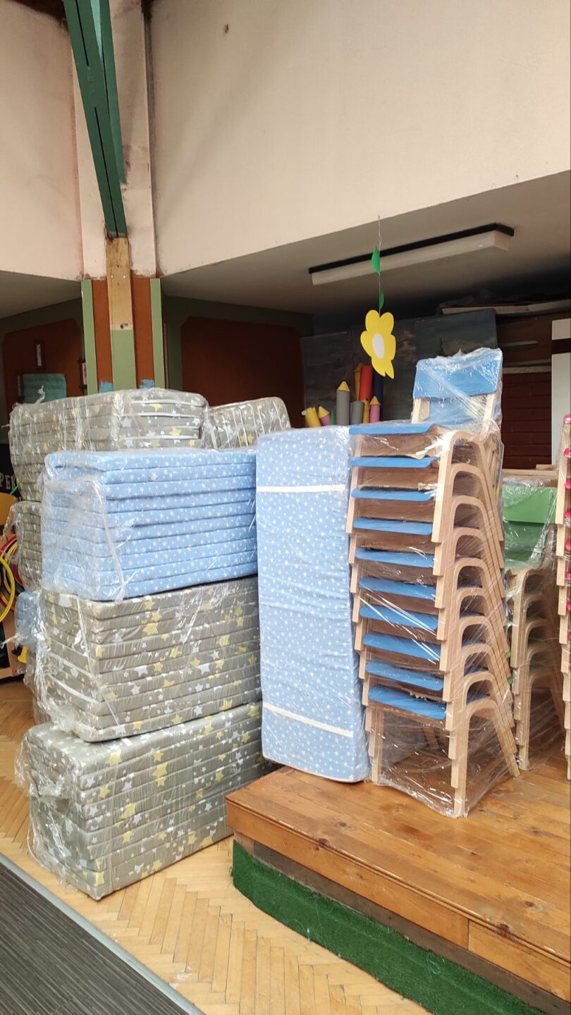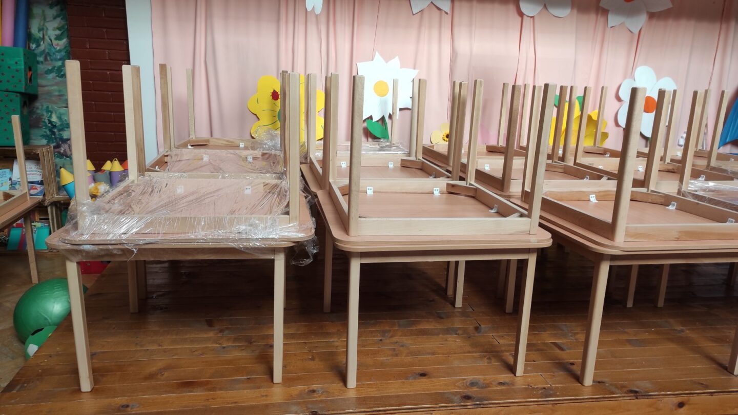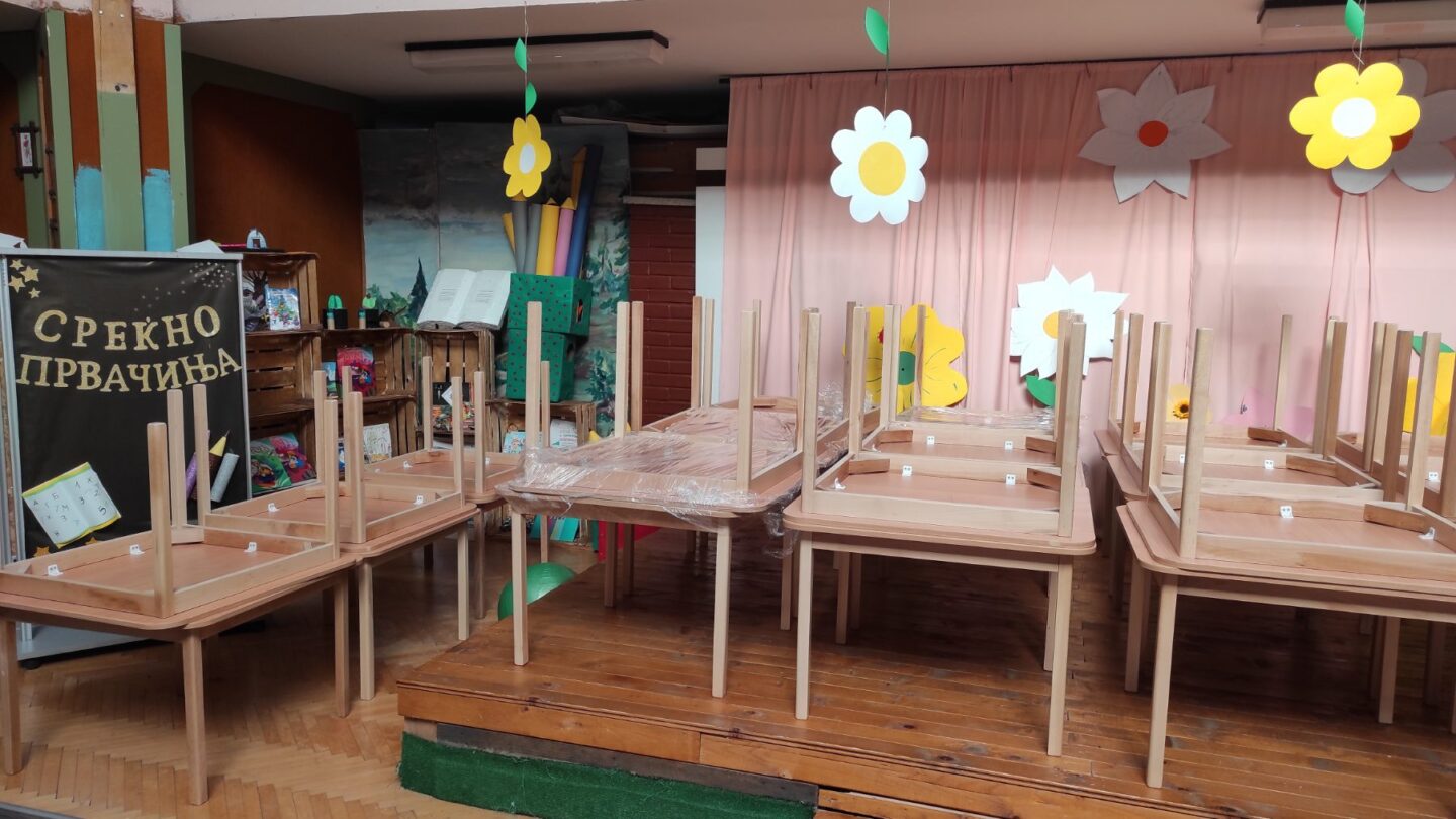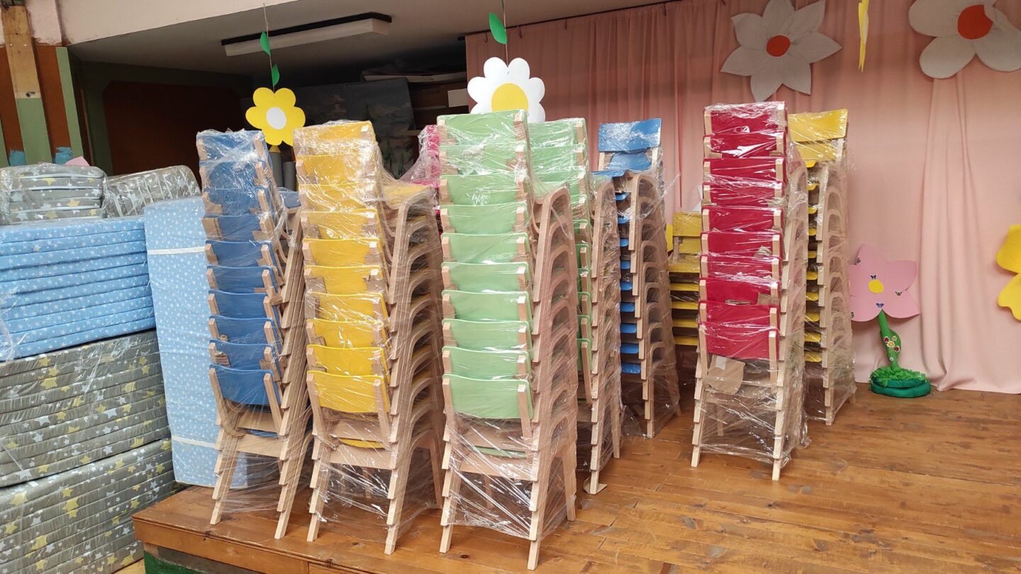 Опремата се состои од 37 детски масички од буково дрво за деца од 2 до 6 години, 100 детски дрвени, анатомски столчиња за деца и 95 детски душеци од 100% памучен материјал.