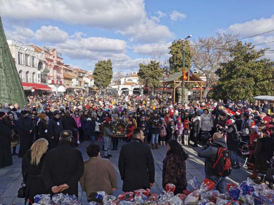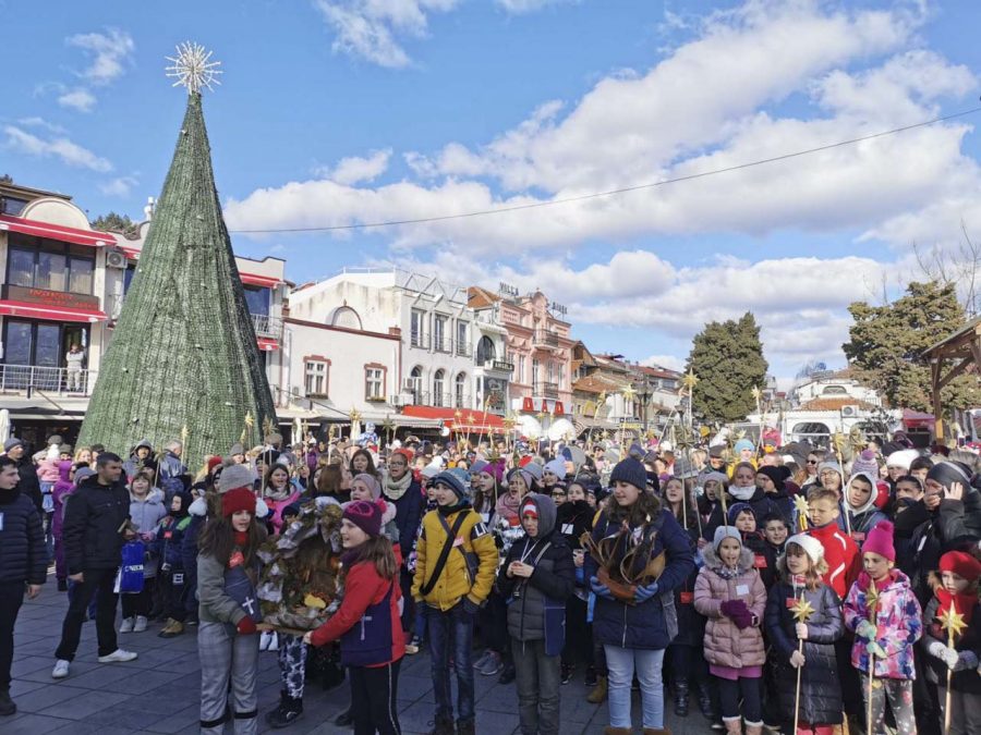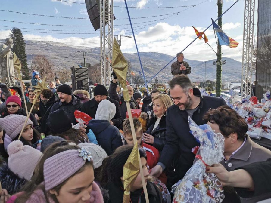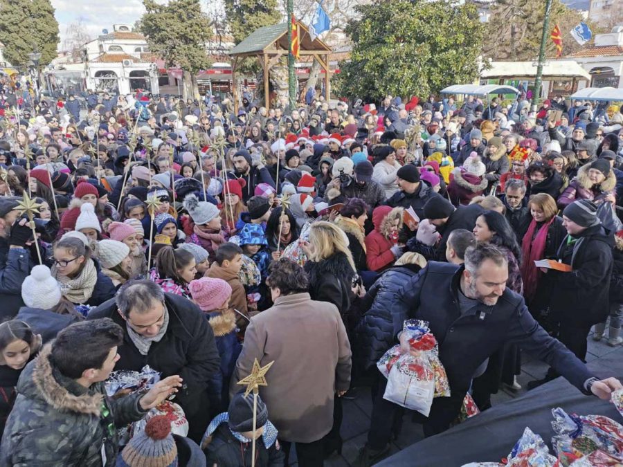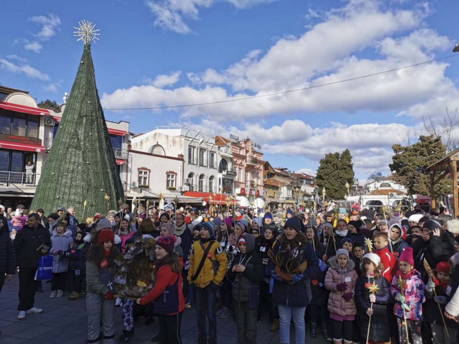 На плоштадот „Св. Климент Охридски“ кај божиќната пештера што е подарок од Бигорскиот манастир, Св. Јован Крстител, коледарчињата ги пречека градоначалникот Константин Георгиески кој ги дарува со божиќни пакетчиња.