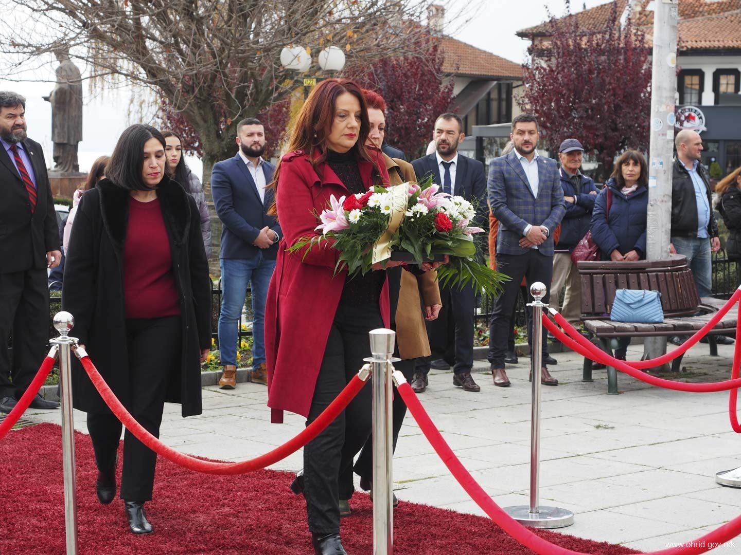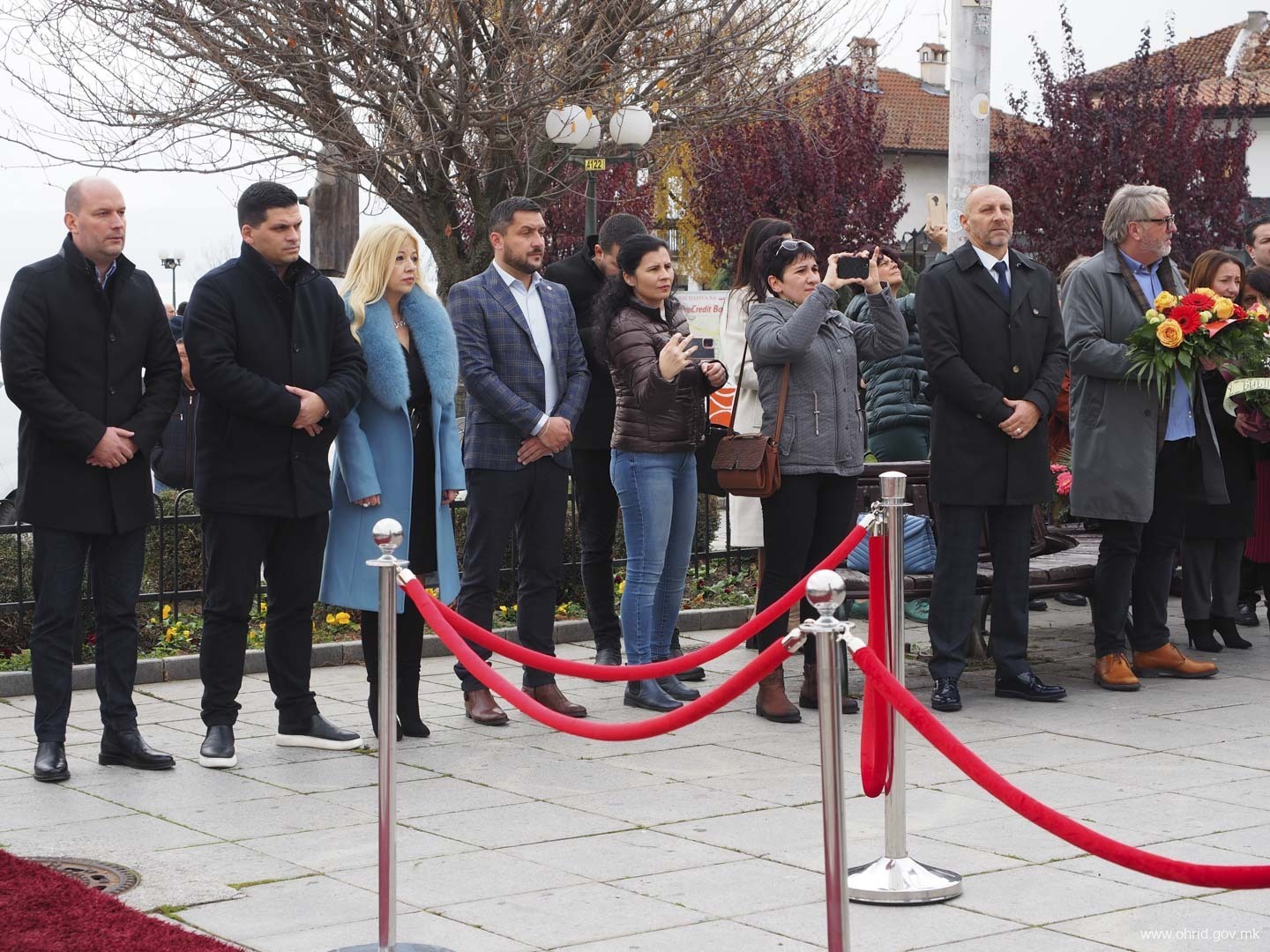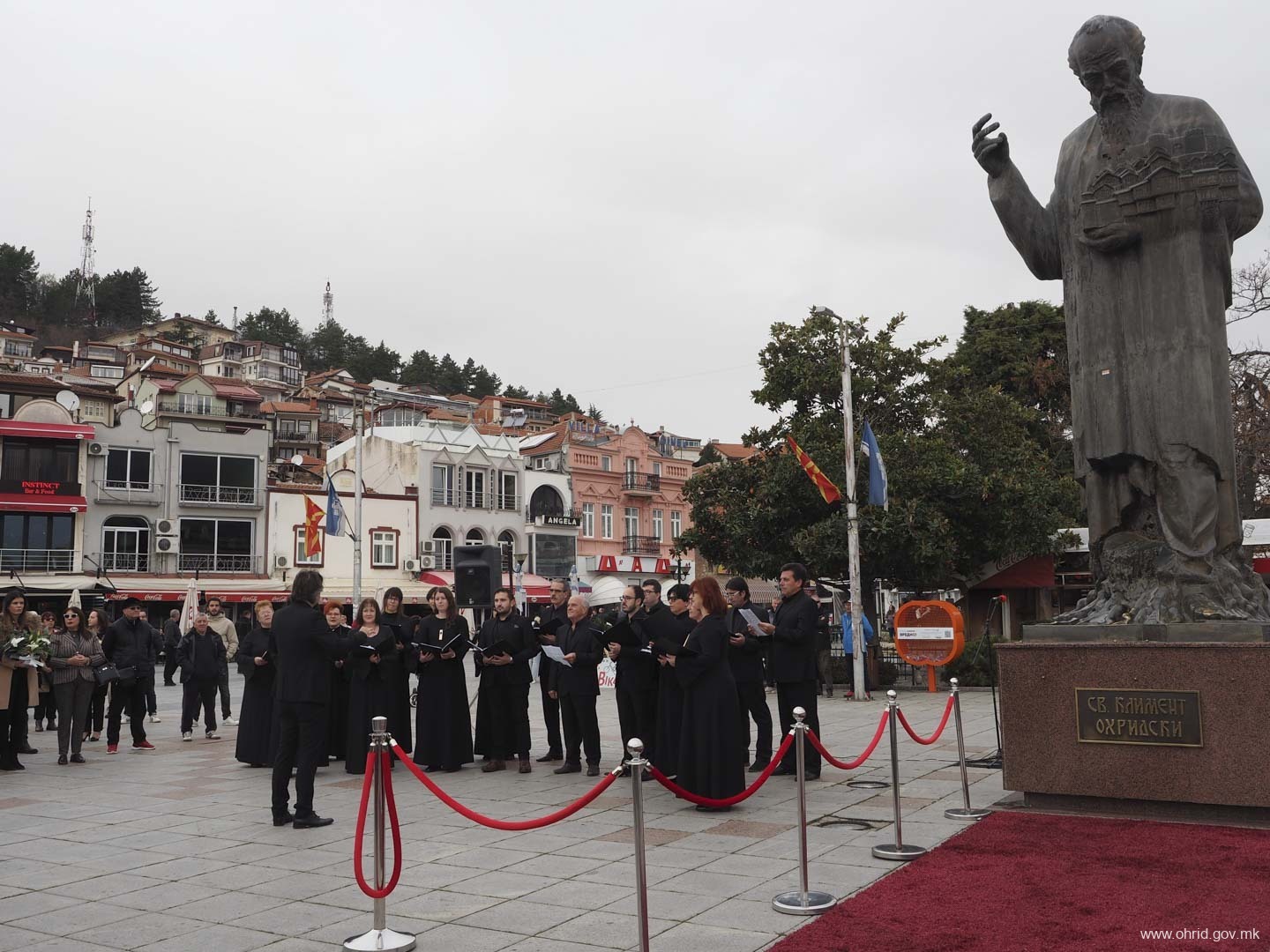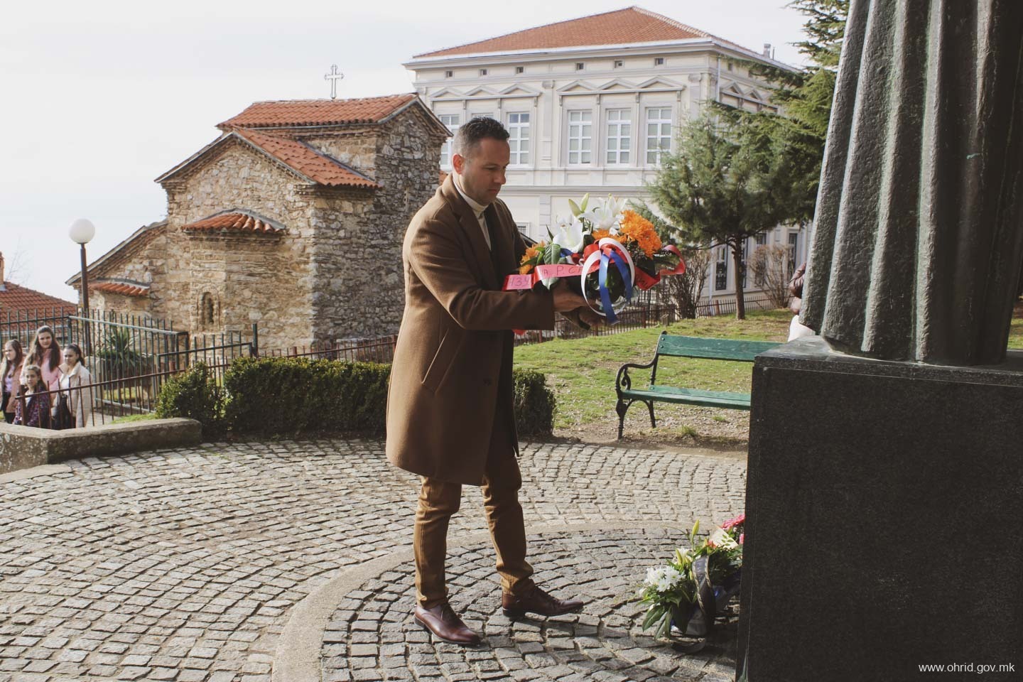 Денеска, во рамки на чествувањата посветени на „Св. Климент Охридски“ – Патрон на Охрид, делегација на Општина Охрид предводена од градоначалникот Кирил Пецаков положи свежо цвеќе пред спомен обележјето на Заштитникот Охридски Светителот „Климент Охридски“. Цвеќе положија и делегации од збратимените и пријателски градови, претставници од политичкиот и јавниот живот од градов меѓу кои и од   охридската гимназија и  битолскиот универзитет „Св. Климент Охридски“.
