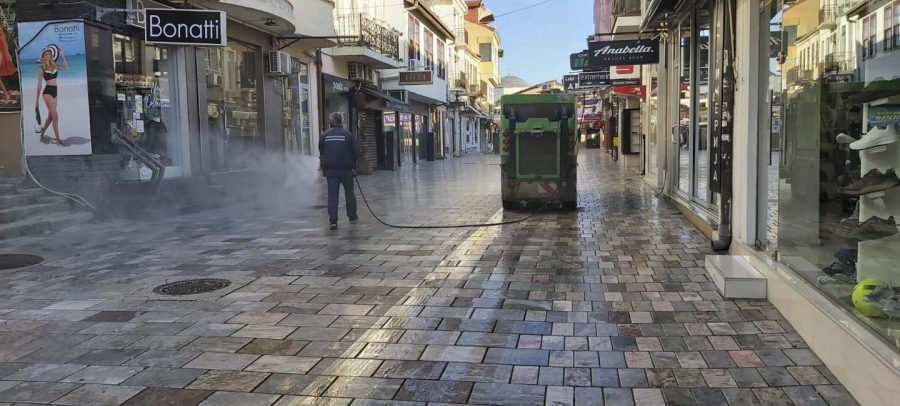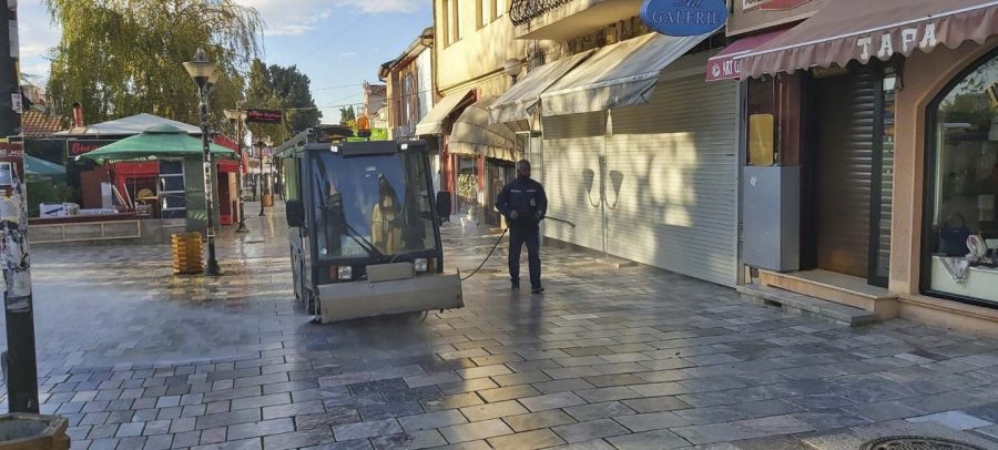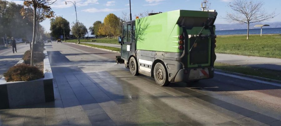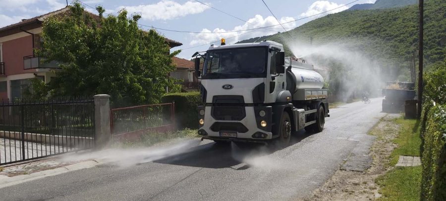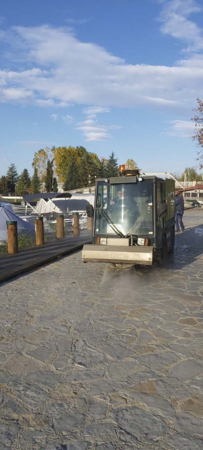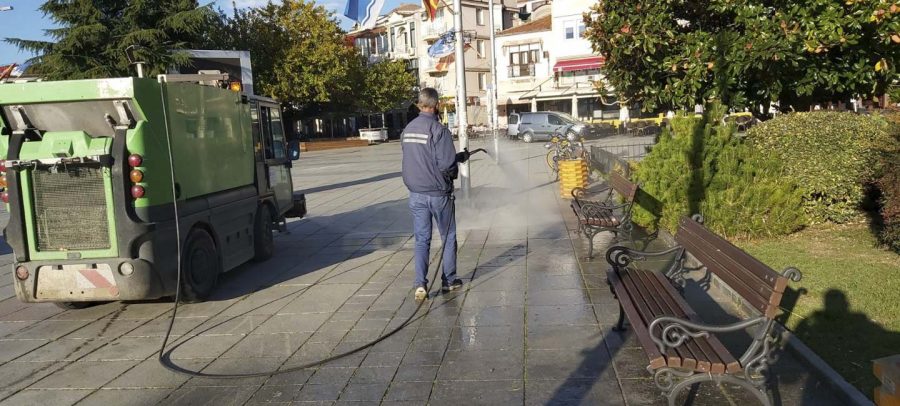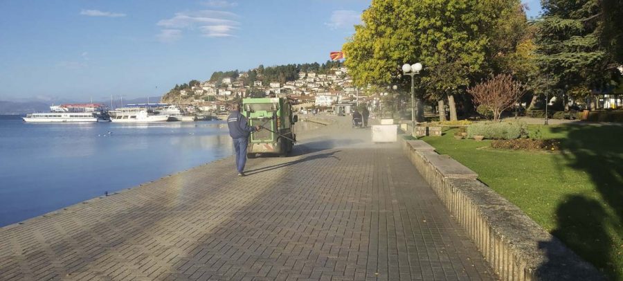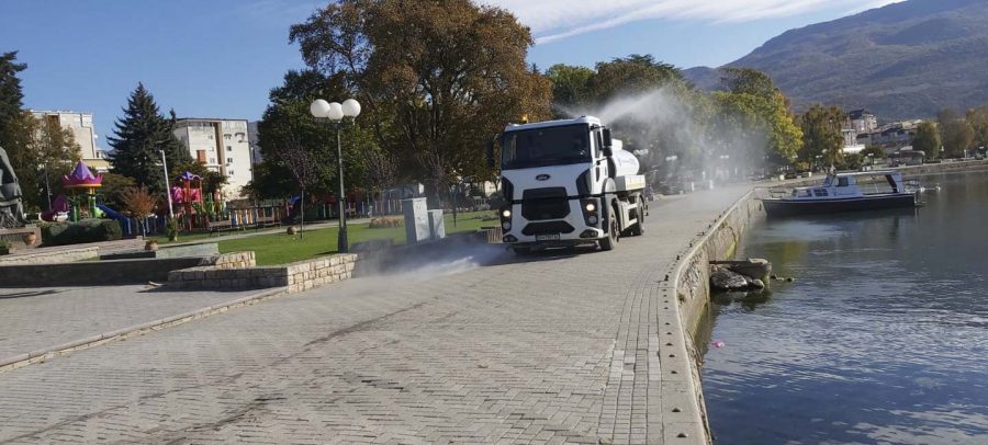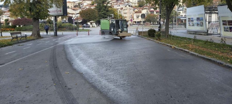 Од утринава ЈП „Охридски Комуналец“, врши дезинфекција на јавните површни низ градот. Со средство за дезинфекција се изврши миење на улиците низ целиот град, градскиот кеј, пешачките патеки, просторот во и околу болничкиот комплекс и сите фреквентни локации во градот.