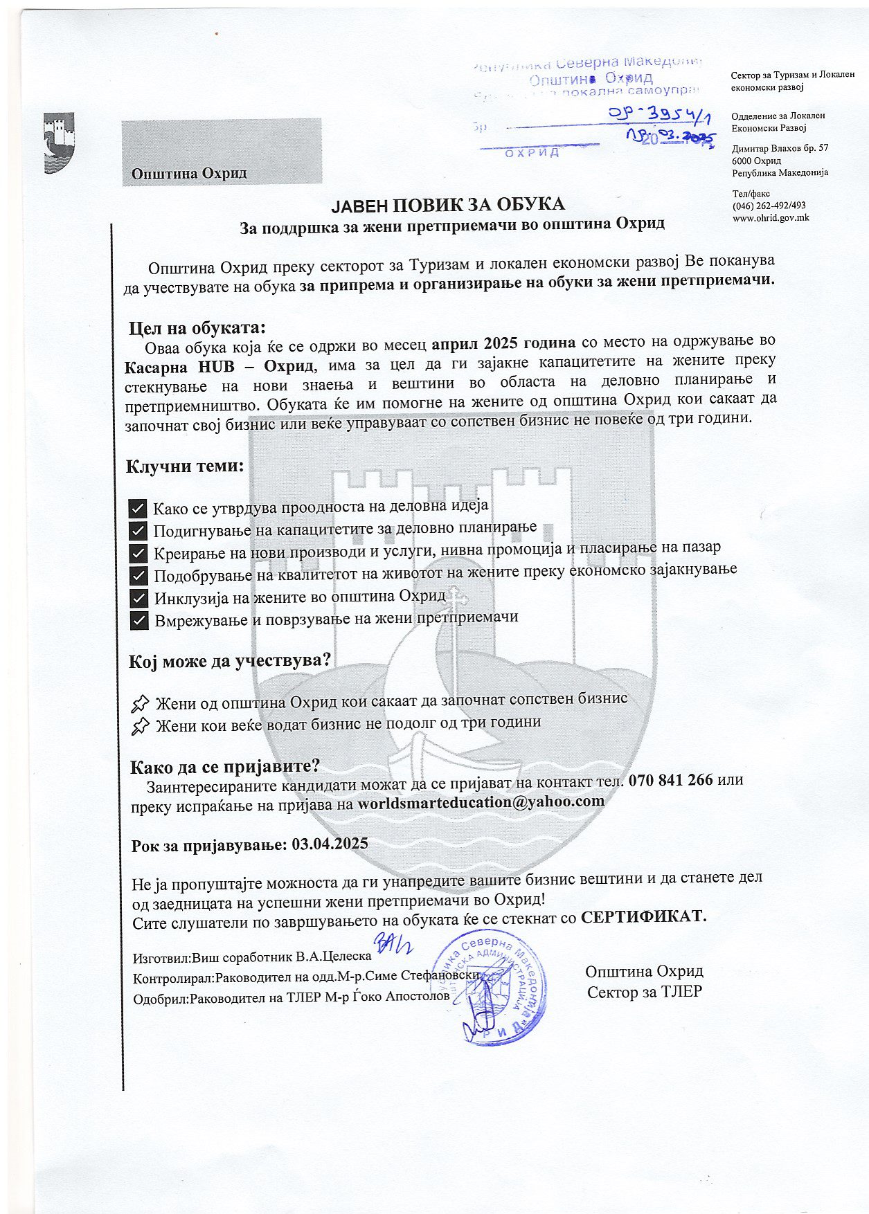 Општина Охрид преку секторот за Туризам и локален економски развој Ве поканува да учествувате на обука за припрема и организирање на обуки за жени претприемачи: