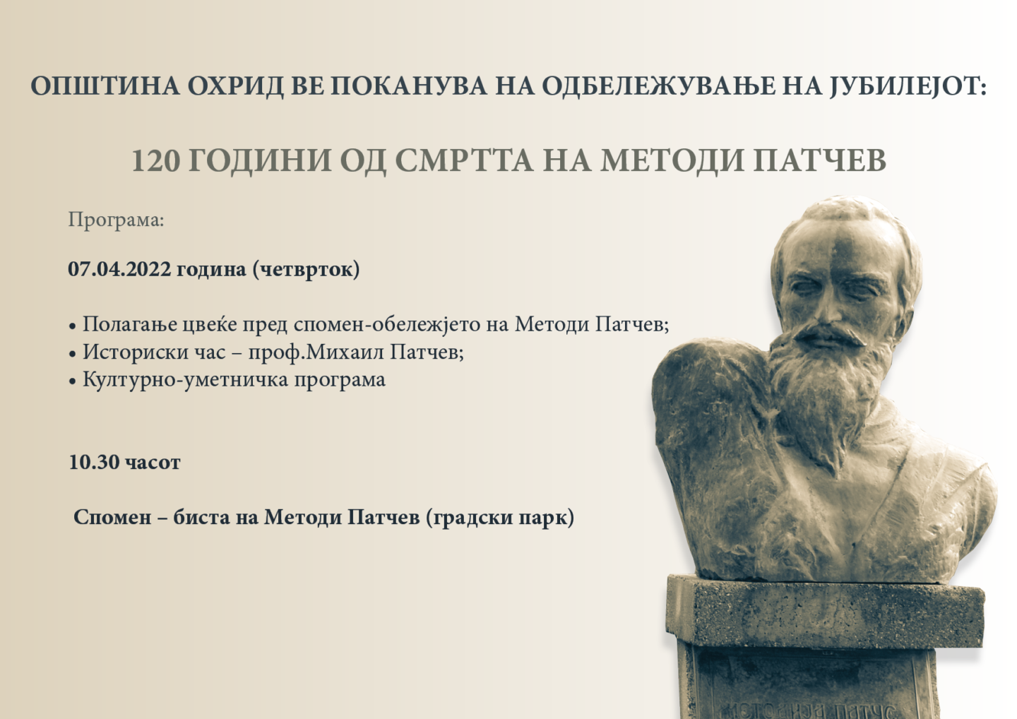 На пригоден начин, Општина Охрид во четврток  ќе го одбележи јубилејот, 120 години од  смртта на Методи Патчев.