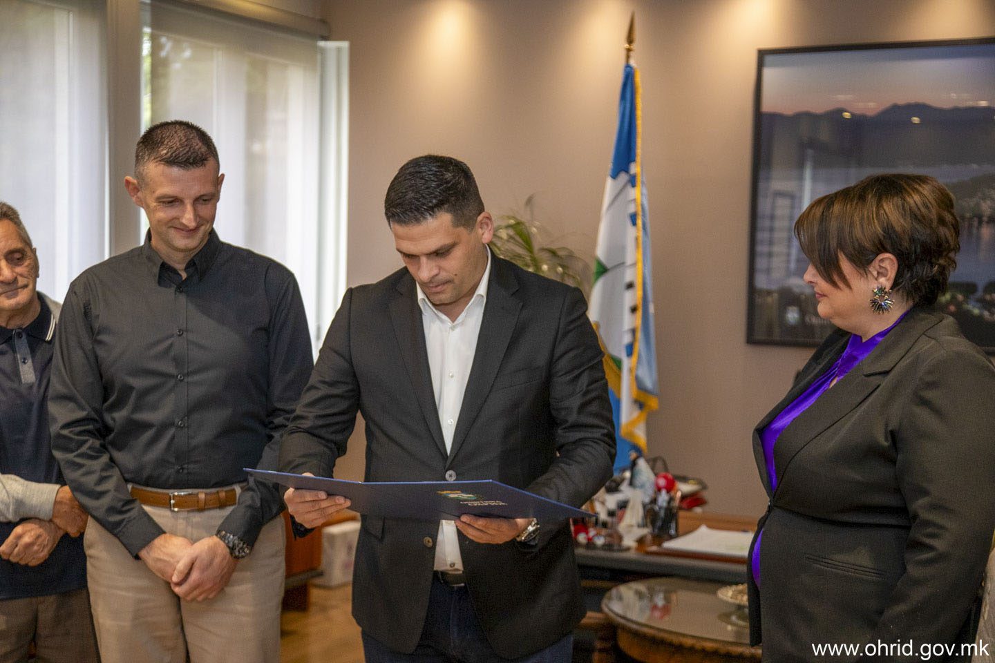 Претседателката на Општинската изборна комисија Антигона Сионов, денеска официјално му го врачи Уверението за избор на градоначалник на Општина Охрид, на досегашниот градоначалник Кирил Пецаков, за претстојниот четиригодишен мандат. -...
