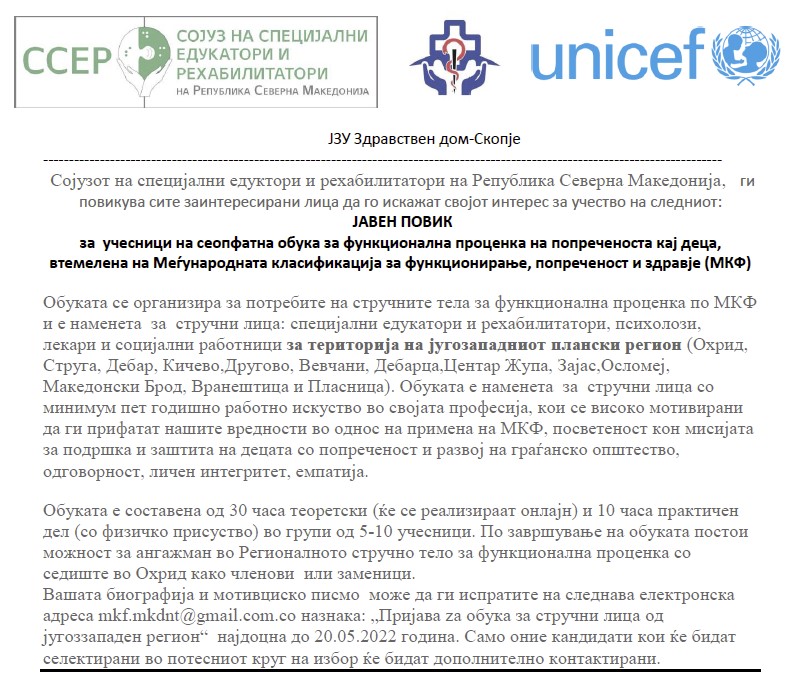 Сојузот на специјални едукaтори и рехабилитатори на Република Северна Македонија, ги повикува сите заинтересирани лица да го искажат својот интерес за учество на Јавниот повик за учество на сеопфатна обука...