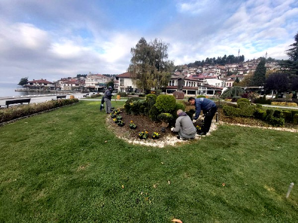 Екипи на „Паркови и зеленило “ при Јавното претпријатие „Охридски комуналец“ денес засадуваат цветен саден материјал од зимската реколта на кружните текови во близина на гимназијата и кај Охридска Банка...