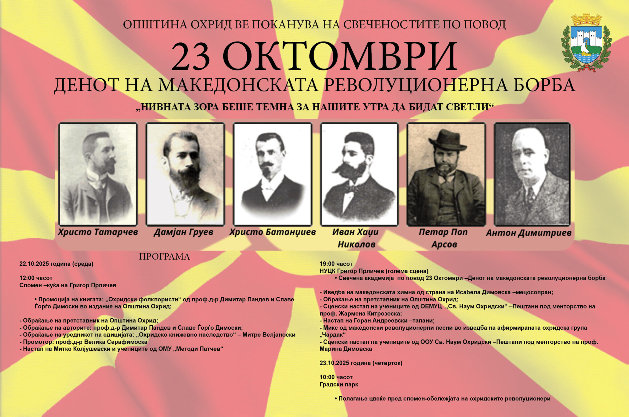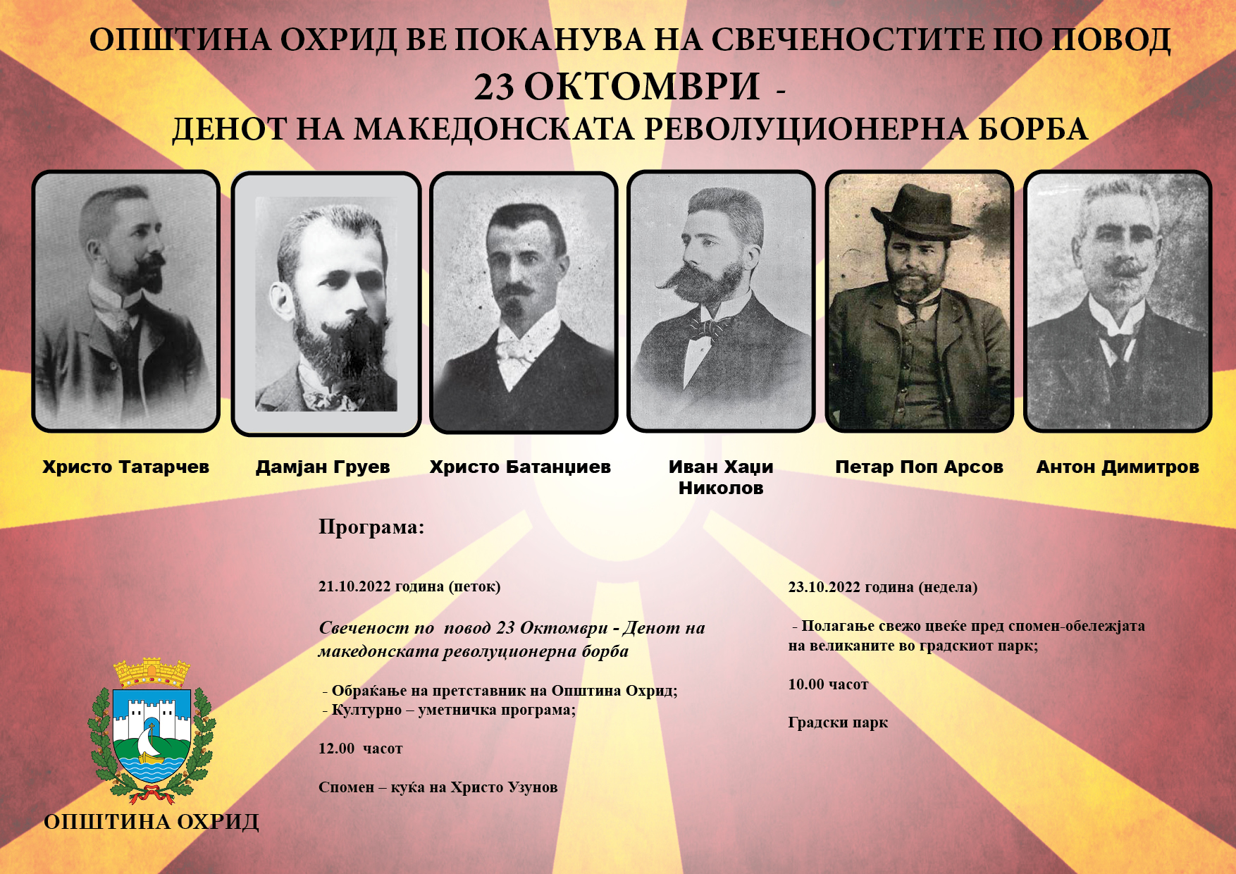 Програма: 21.10.2022 година (петок) Свеченост по повод 23 Октомври - Денот на македонската револуционерна борба Oбраќање на претставник на Општина Охрид; Културно – уметничка програма; 12.00 часот Спомен –...