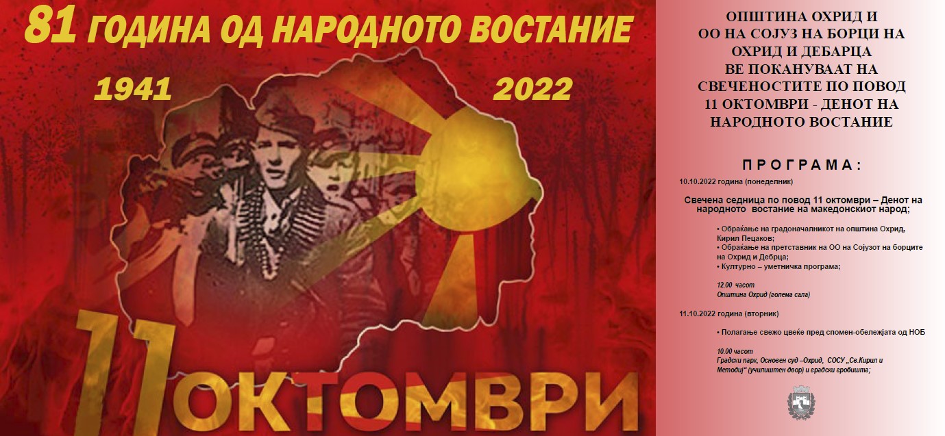 ОПШТИНА ОХРИД И ОО НА СОЈУЗОТ НА БОРЦИ ОД ОХРИД И ДЕБАРЦА ВЕ ПОКАНУВААТ НА СВЕЧЕНОСТИТЕ ПО ПОВОД 11 ОКТОМВРИ – ДЕНОТ НА НАРОДНОТО ВОСТАНИЕ Програма: 10.10.2024 година...