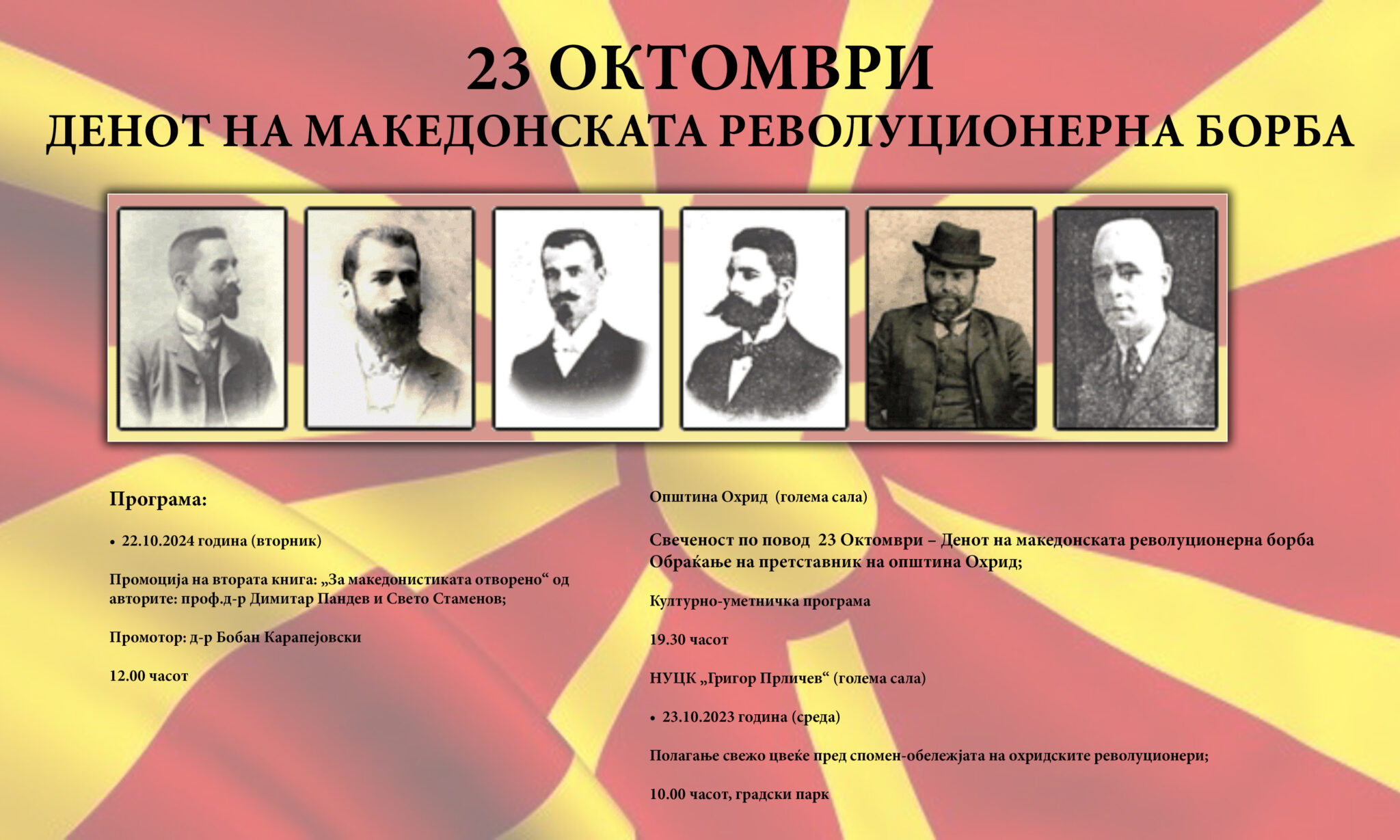 ОПШТИНА ОХРИД ВЕ ПОКАНУВА НА СВЕЧЕНОСТИТЕ ПО ПОВОД 23 Октомври –Денот на македонската револуционерна борба Програма: 22.10.2024 година (вторник) Промоција на втората книга: „За македонистиката отворено“ од авторите:...