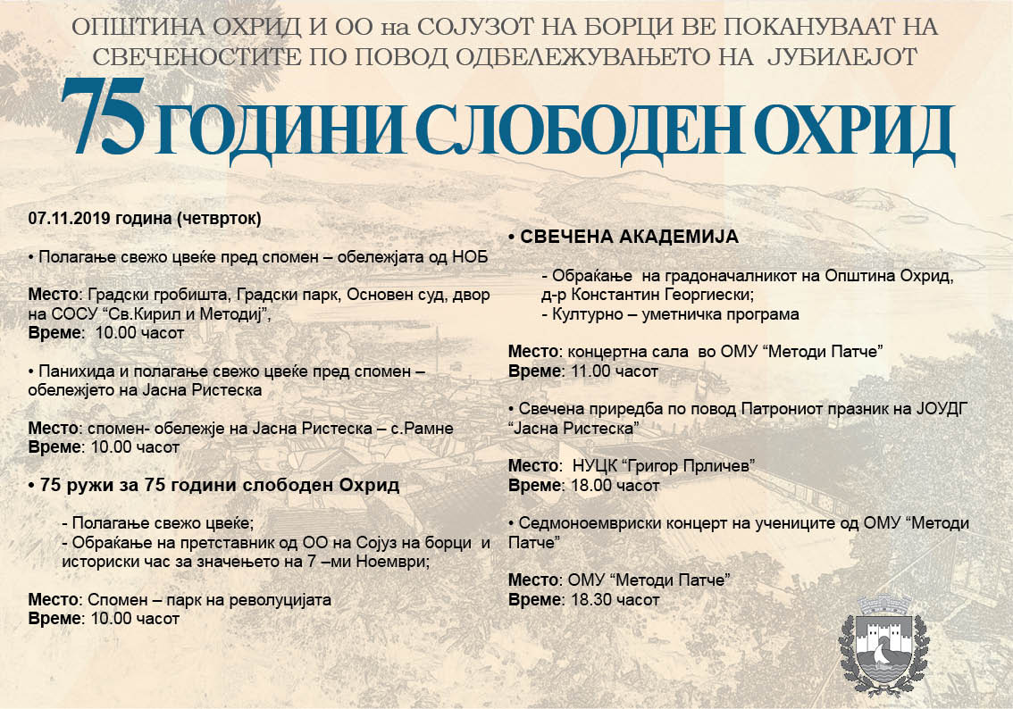 ОПШТИНА ОХРИД И ОО на СОЈУЗОТ НА БОРЦИ ВЕ ПОКАНУВААТ НА СВЕЧЕНОСТИТЕ ПО ПОВОД ОДБЕЛЕЖУВАЊЕТО НА ЈУБИЛЕЈОТ 75 ГОДИНИ СЛОБОДЕН ОХРИД 07.11.2019 година (четврток) • Полагање свежо цвеќе...