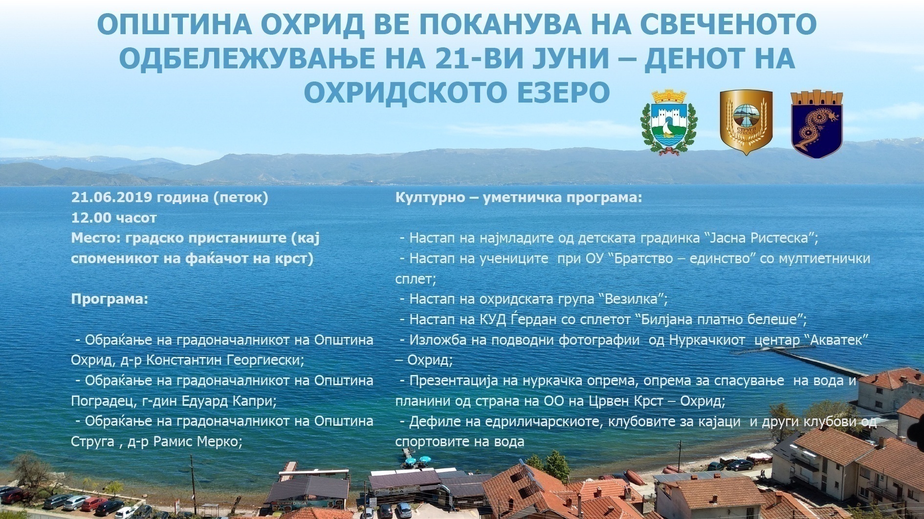 [caption id="attachment_7118" align="alignleft" width="197"] @[/caption] 21.06.2019 година (петок) 12.00 часот Место: градско пристаниште (кај споменикот на фаќачот на крст) Програма: - Обраќање на градоначалникот на Општина Охрид, д-р Константин Георгиески;...